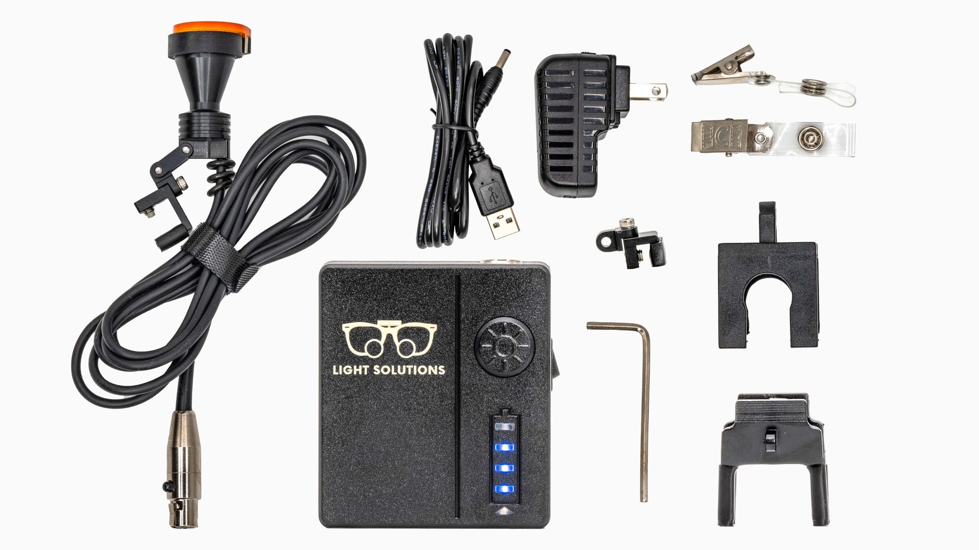 Purchase includes one light unit, Universal Clip attachment, U-Shaped attachment for Flip Up loupes, Charger, and 1 battery pack.