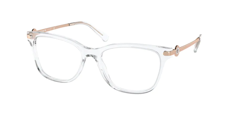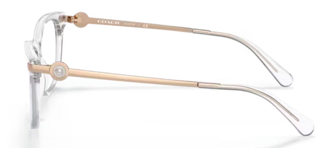 A feminine rectangular acetate front in a simple clear and rose gold color way. The Bonnie Cashin Button logo encased in striking enamel on a light metal temple takes this simple style to the next level.